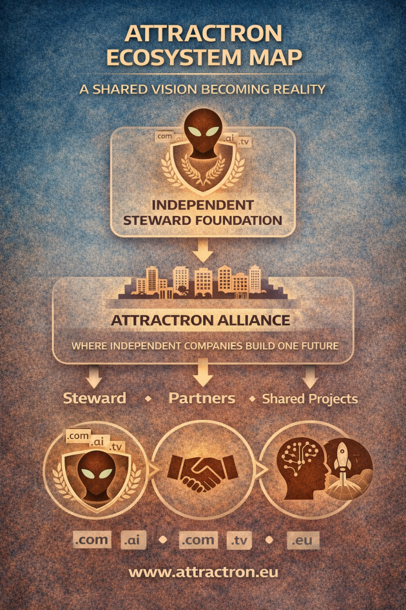The Attractron Brand operates across three complementary domains (.com · .ai · .tv), providing a coherent and flexible foundation for future development and expansion.